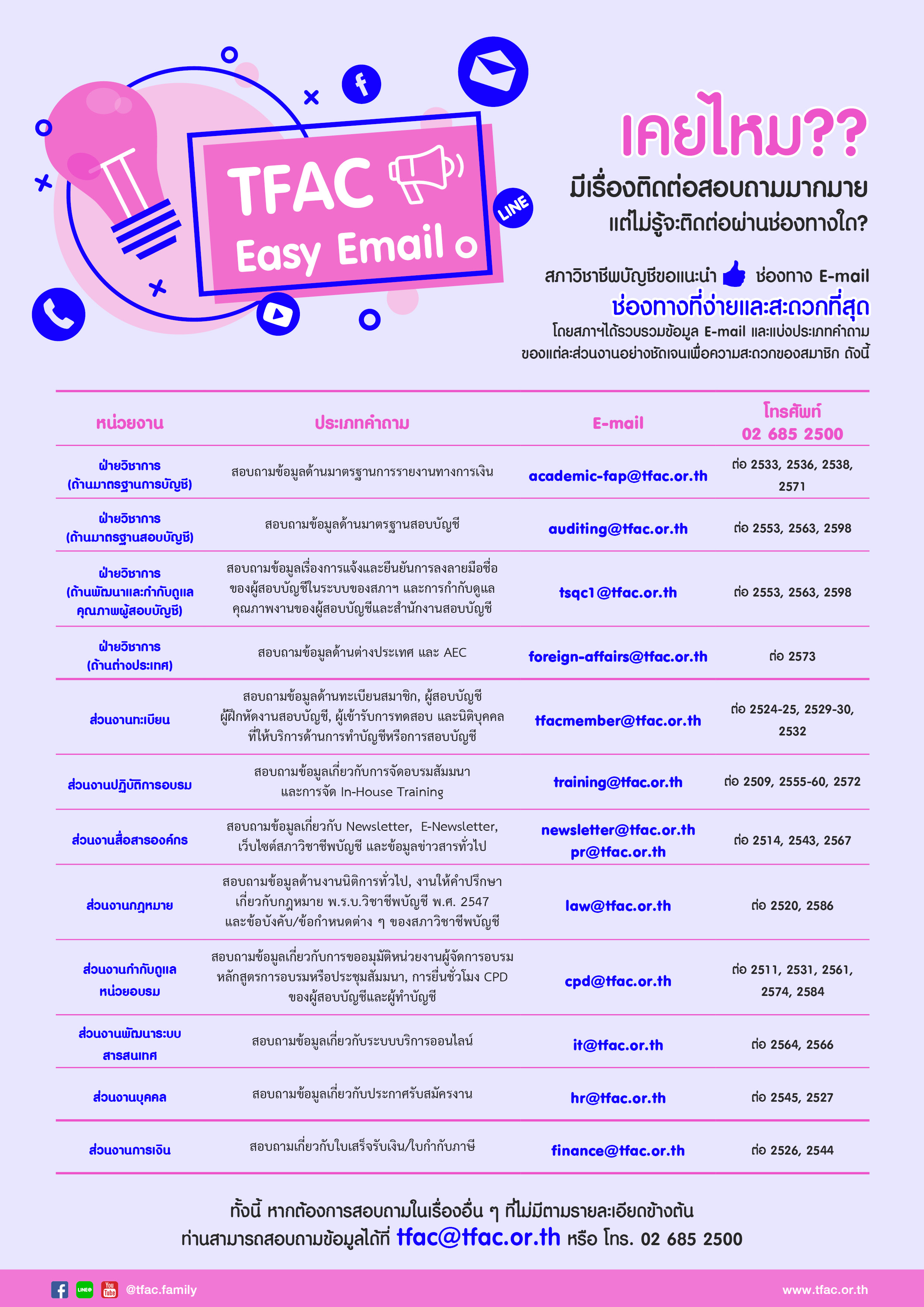 สมาชิกสามารถดำเนินการชำระเงิน หรือยื่นหลักฐานผ่านช่องทางบริการออนไลน์ของสภาวิชาชีพบัญชี เว็บไซต์ : www.tfac.or.th เลือกบริการออนไลน์ หัวข้อ ระบบสมาชิกและผู้สอบบัญชี หรือ แจ้งพัฒนาความรู้ต่อเนื่อง CPD ผู้สอบบัญชี/ผู้ทำบัญชี ซึ่งสมาชิกที่ดำเนินการผ่านช่องทางบริการออนไลน์แล้วสมาชิกไม่ต้องส่งเอกสารมาทางโทรสาร (Fax) หรือทางไปรษณีย์ ทั้งนี้ หากสมาชิกต้องการสอบถามข้อมูลเพิ่มเติมโปรดติดต่อส่วนทะเบียน หมายเลขโทรศัพท์ 0 2685 2525, 0 2685 2532 หรือ ส่วนกำกับดูแลหน่วยงานอบรม หมายเลขโทรศัพท์ 0 2685 2511, 0 2685 2574