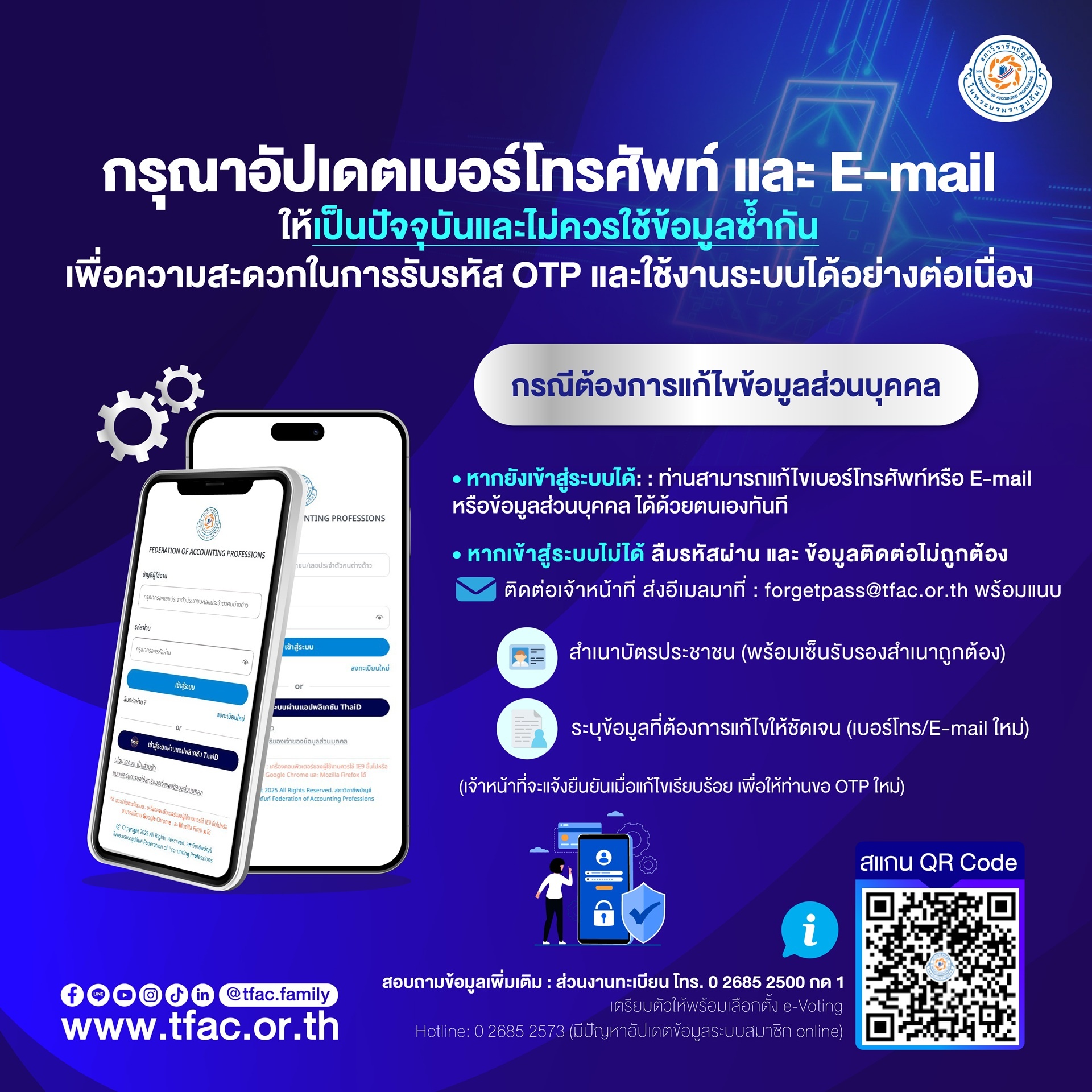 Hotline: 0 2685 2573 มีปัญหาการอัปเดตข้อมูลระบบสมาชิก Online (เฉพาะงานเลือกตั้ง e-Voting)