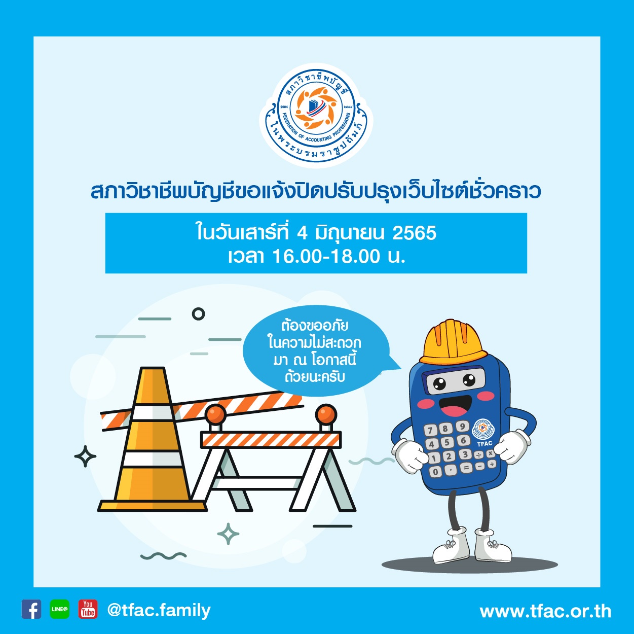 ขอแจ้งปิดปรับปรุงเว็บไซต์ชั่วคราวในวันเสาร์ที่ 4 มิถุนายน 2565 เวลา 16.00-18.00 น.