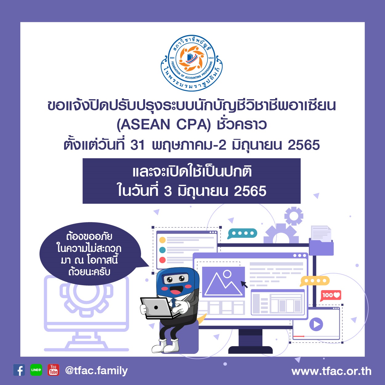 สภาวิชาชีพบัญชีขอแจ้งปิดปรับปรุงระบบนักบัญชีวิชาชีพอาเซียน (ASEAN CPA) ชั่วคราว ตั้งแต่วันที่ 31 พฤษภาคม- 2 มิถุนายน 2565 และจะเปิดใช้เป็นปกติในวันที่ 3 มิถุนายน 2565