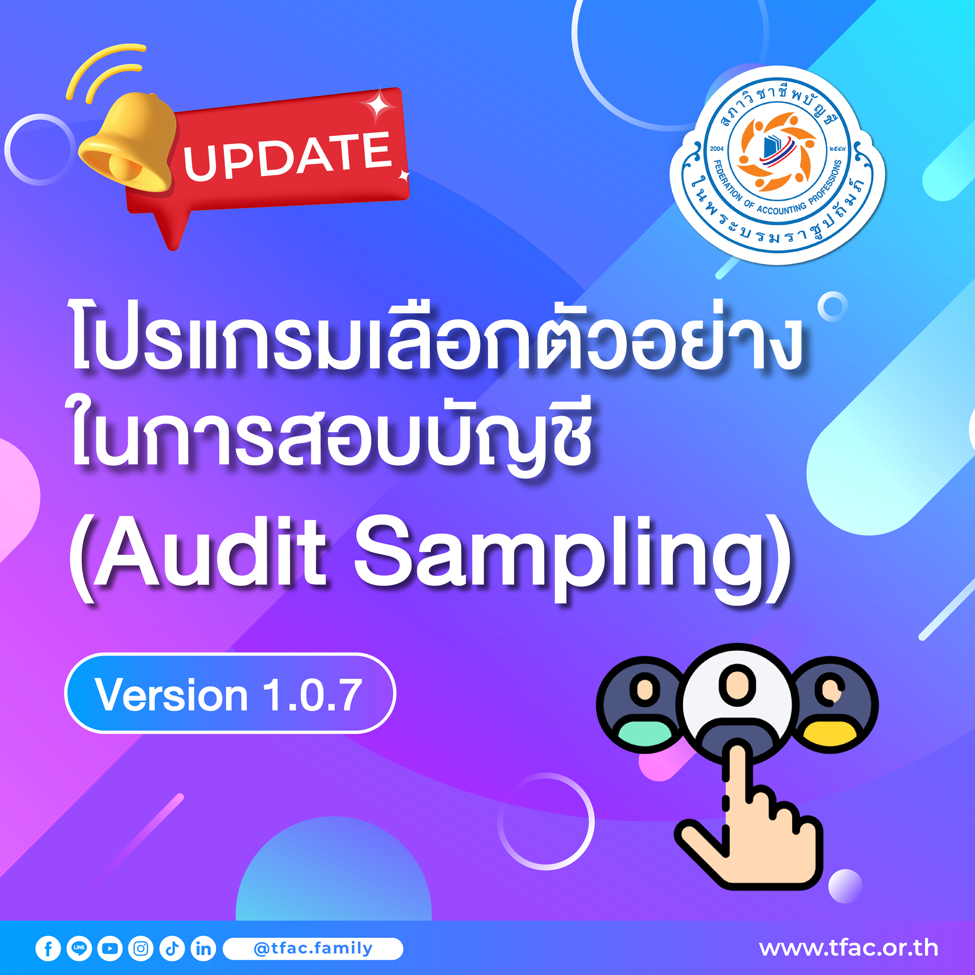 สภาวิชาชีพบัญชีขอประกาศใช้งานโปรแกรม Audit Sampling version 1.0.7 โดยมีการปรับแก้ไขโปรแกรม version 1.0.6 ดังนี้