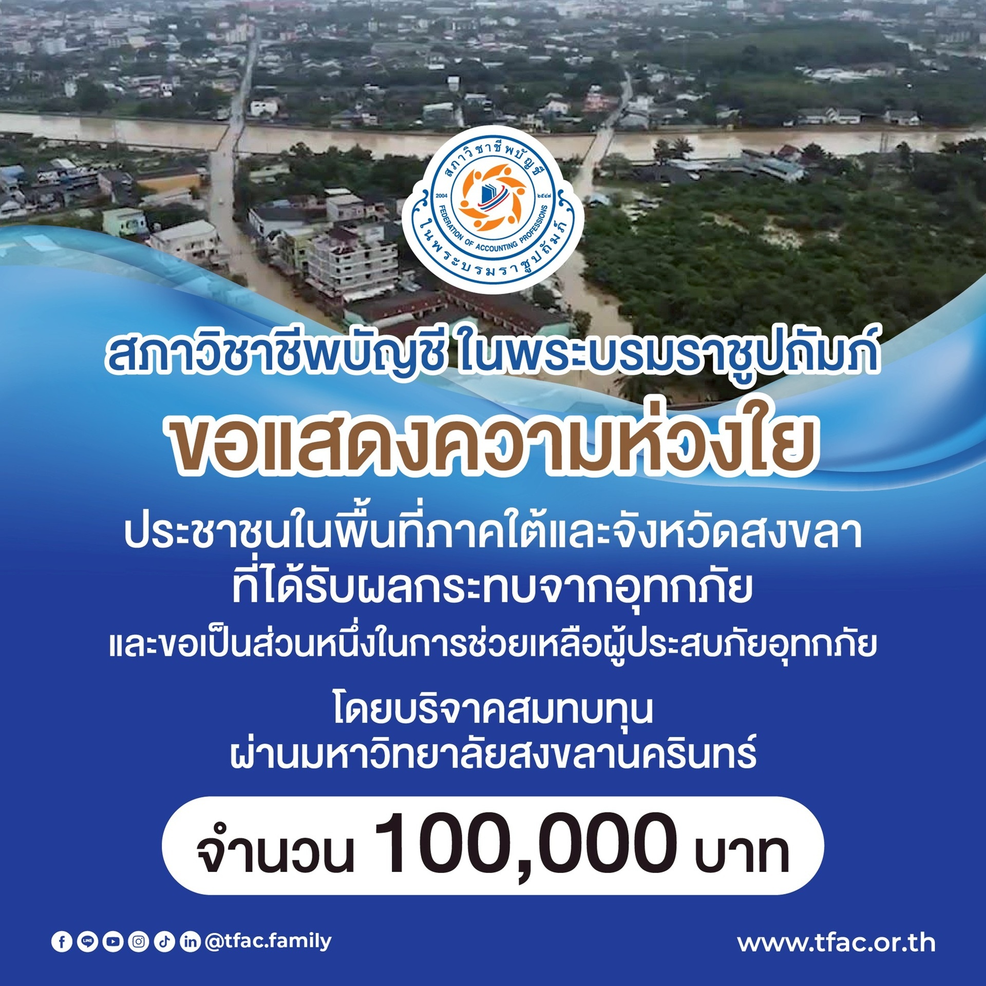 สภาวิชาชีพบัญชีขอแสดงความห่วงใยและขอเป็นส่วนหนึ่งในการช่วยเหลือผู้ประสบอุทกภัยในพื้นที่ภาคใต้และจังหวัดสงขลา โดยบริจาคสมทบทุนจำนวน 100,000 บาท ผ่านมหาวิทยาลัยสงขลานครินทร์