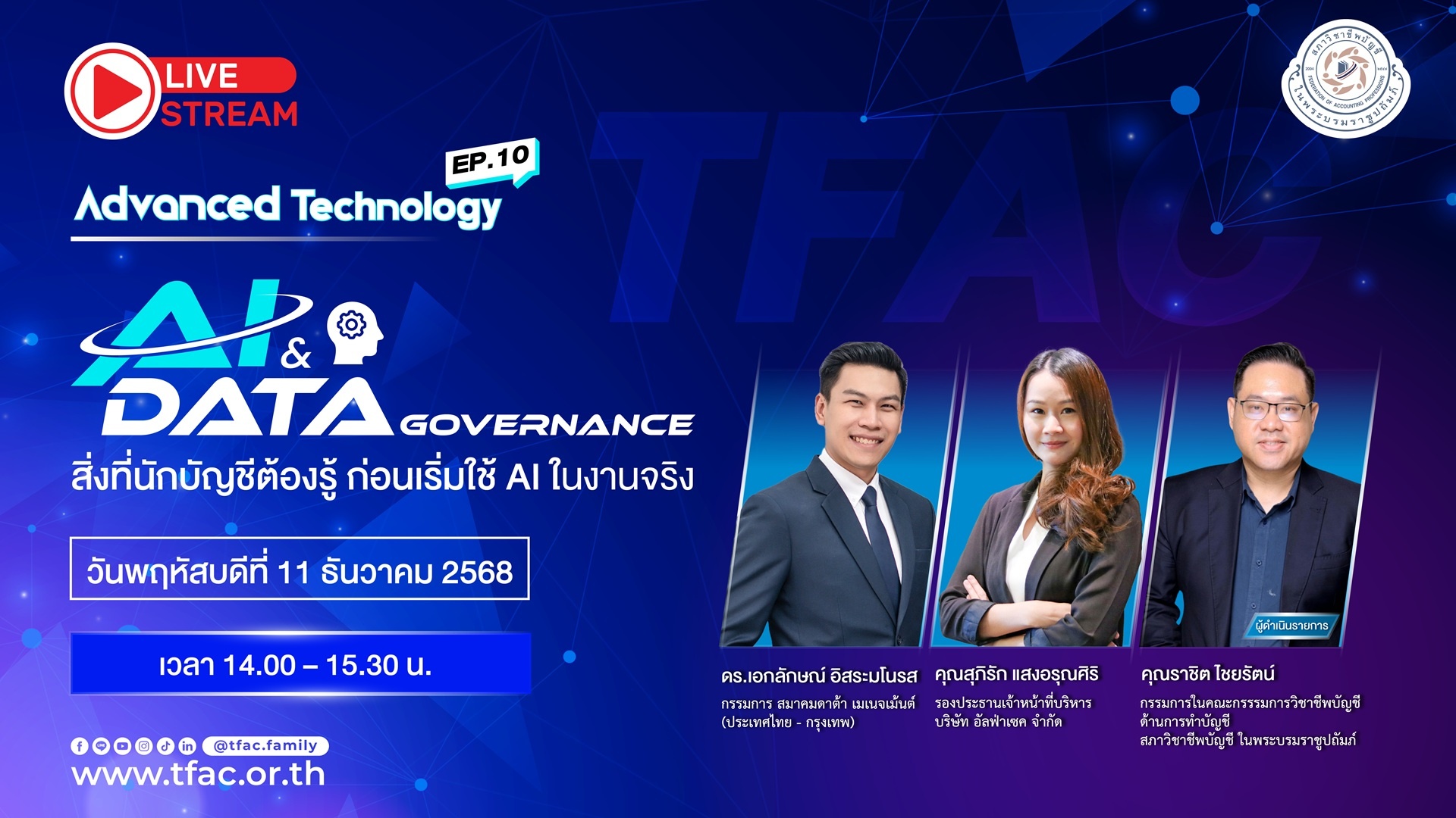 • Advanced Technology EP: 10 หัวข้อ " AI and Data Governance: สิ่งที่นักบัญชีต้องรู้ ก่อนเริ่มใช้ AI ในงานจริง