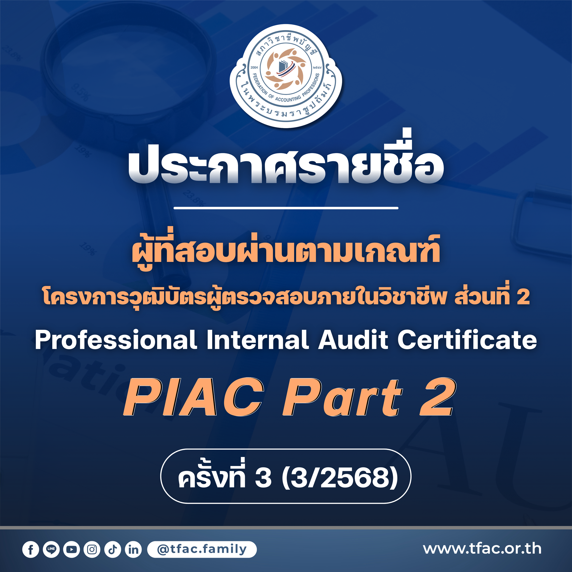ประกาศรายชื่อผู้ที่สอบผ่านตามเกณฑ์ โครงการวุฒิบัตรผู้ตรวจสอบภายในวิชาชีพ ส่วนที่ 2 Professional Internal Audit Certificate (PIAC) Part 2 ครั้งที่ 3 (3/2568)