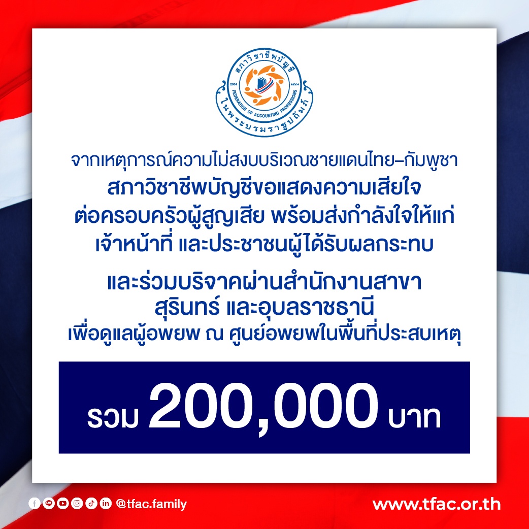 สภาวิชาชีพบัญชี ขอแสดงความเสียใจต่อครอบครัวผู้สูญเสียและได้รับบาดเจ็บจากสถานการณ์ชายแดน พร้อมทั้งขอส่งความห่วงใย กำลังใจ แก่เจ้าหน้าที่ทุกภาคส่วนและประชาชนผู้ได้รับผลกระทบ