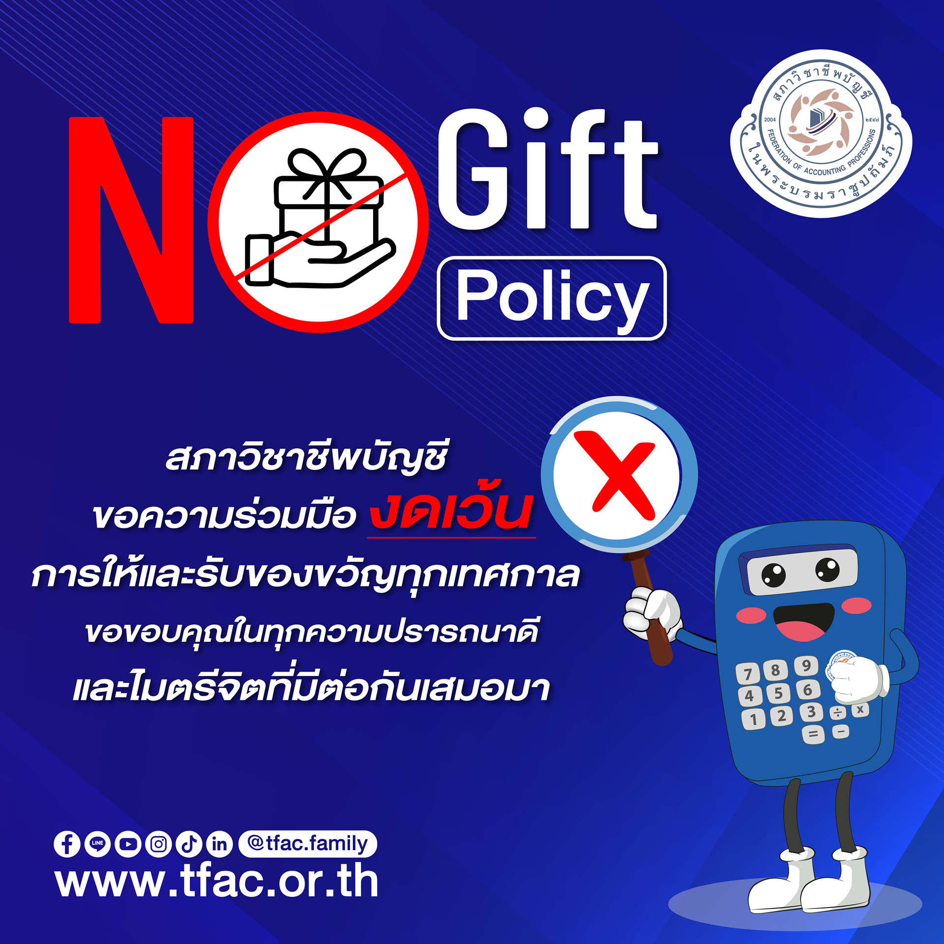 No Gift Policy ความห่วงใยและความปรารถนาดีของทุกท่าน เรารับรู้เสมอ ขอบคุณที่ร่วมมือกันสร้างวัฒนธรรมที่โปร่งใสและยั่งยืน