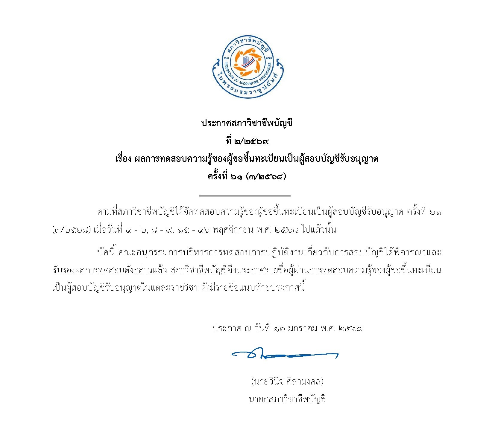 ประกาศผลการทดสอบความรู้ของผู้ขอขึ้นทะเบียนเป็นผู้สอบบัญชีรับอนุญาต ครั้งที่ 61(3/2568)
