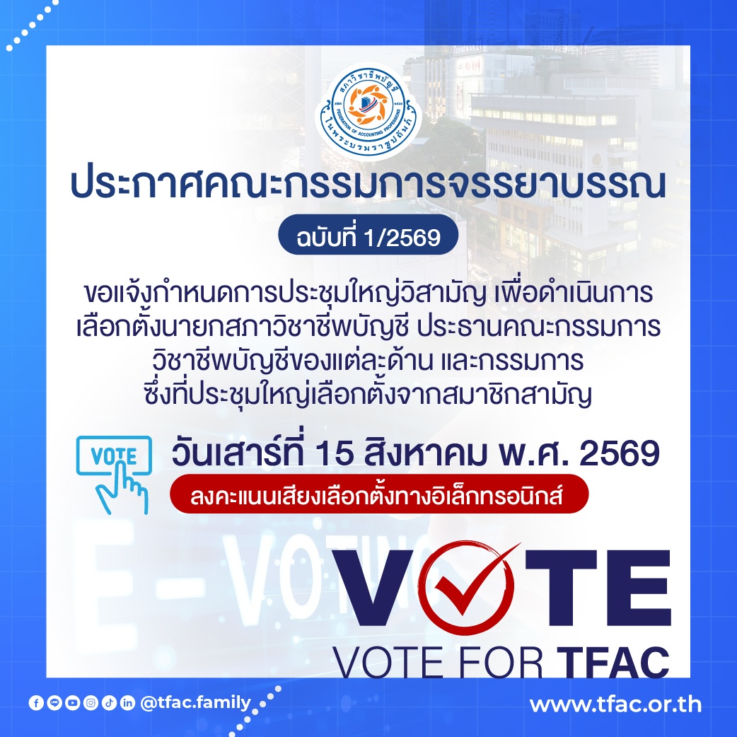 • ประกาศคณะกรรมการจรรยาบรรณฉบับที่ 1/2569  ขอแจ้งกำหนดการประชุมใหญ่วิสามัญ เพื่อดำเนินการเลือกตั้งนายกสภาวิชาชีพบัญชี ประธานคณะกรรมการวิชาชีพบัญชีของแต่ละด้าน และกรรมการซึ่งที่ประชุมใหญ่เลือกตั้งจากสมาชิกสามัญ