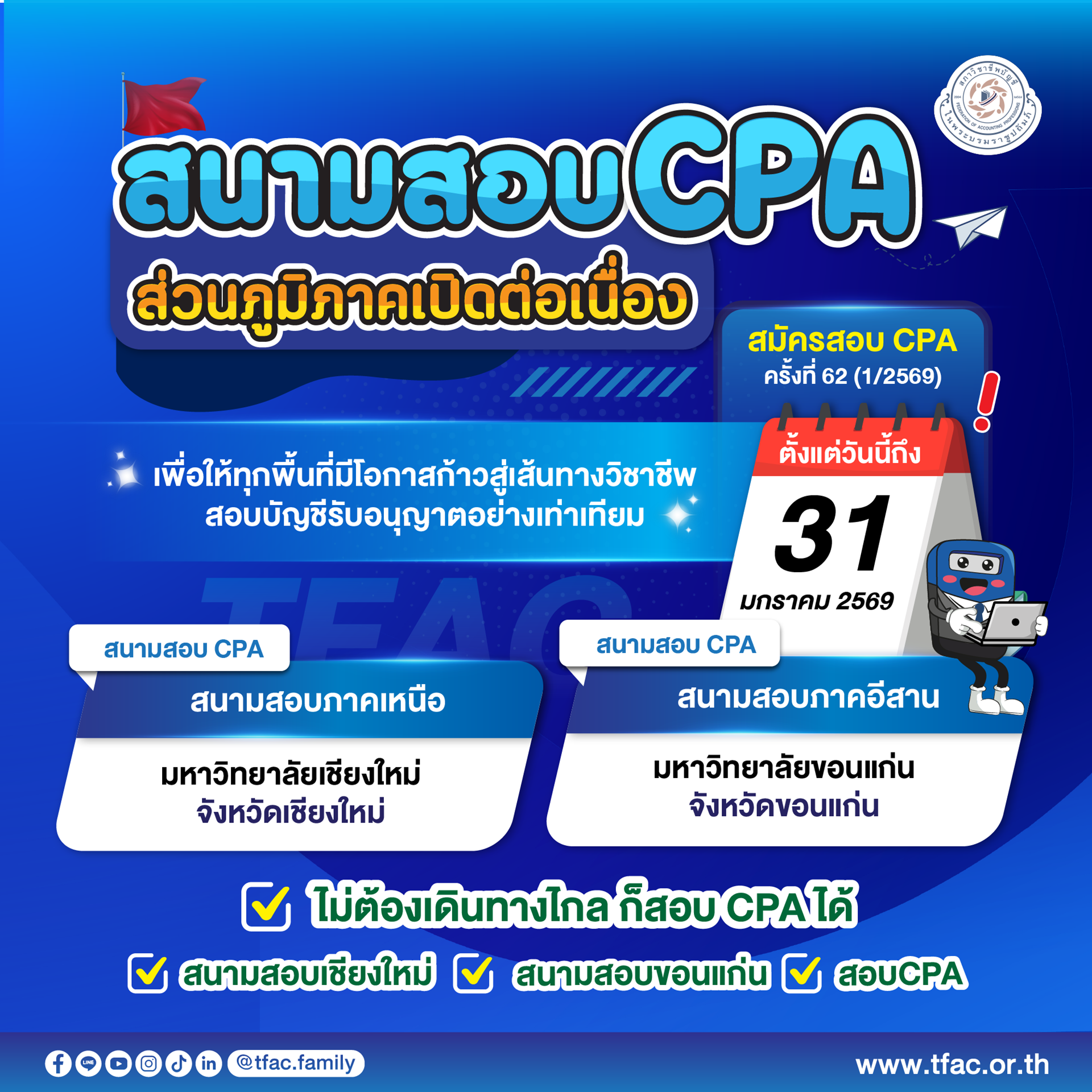 • สภาวิชาชีพบัญชีเปิดสนามสอบสอบ ส่วนภูมิภาคอย่างต่อเนื่อง สำหรับการทดสอบ CPA ครั้งที่ 62 (1/2569)
