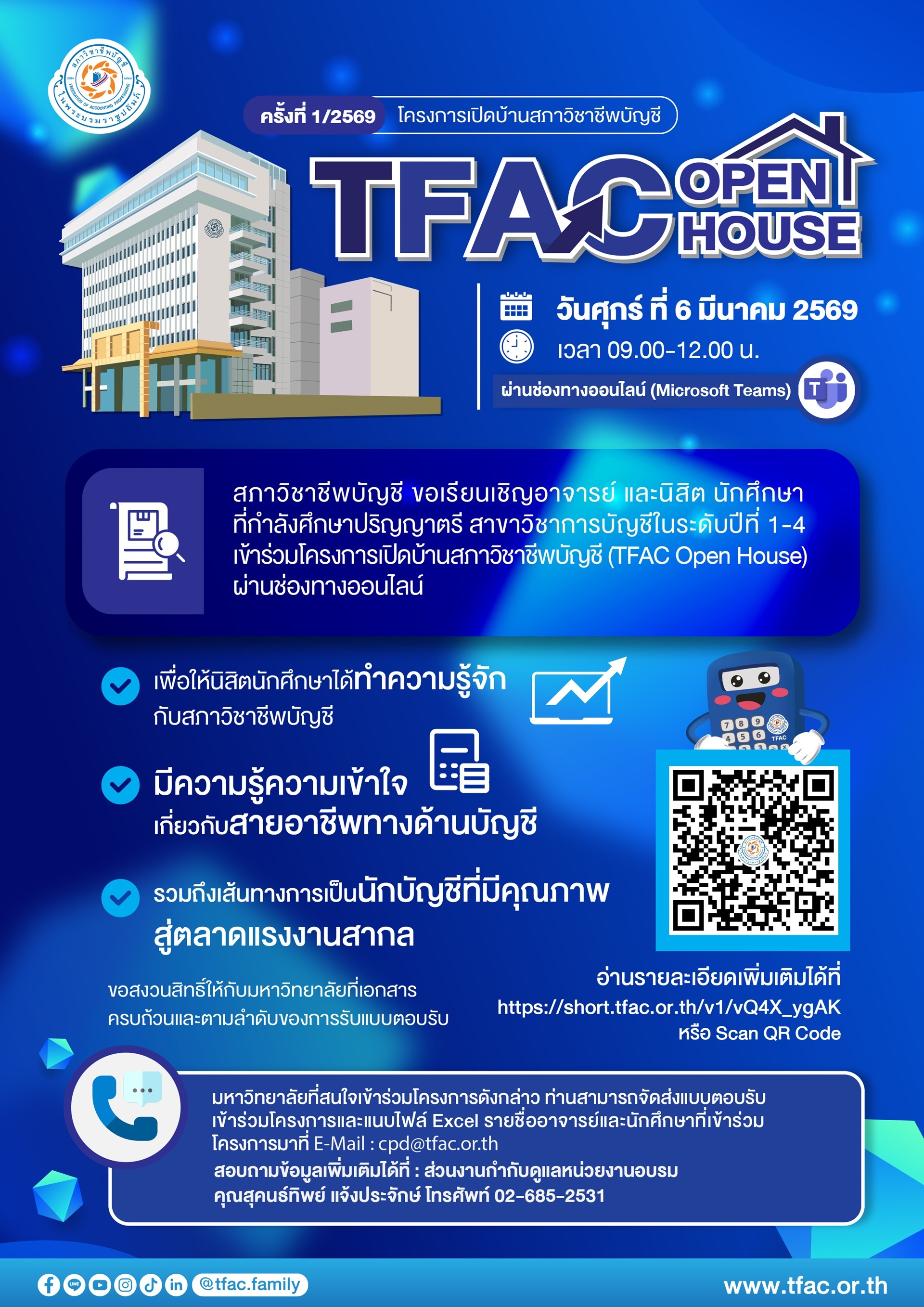 • สภาวิชาชีพบัญชี ขอเรียนเชิญอาจารย์ และนิสิต นักศึกษาเข้าร่วมโครงการเปิดบ้านสภาวิชาชีพบัญชี TFAC Open House ครั้งที่ 1/2569