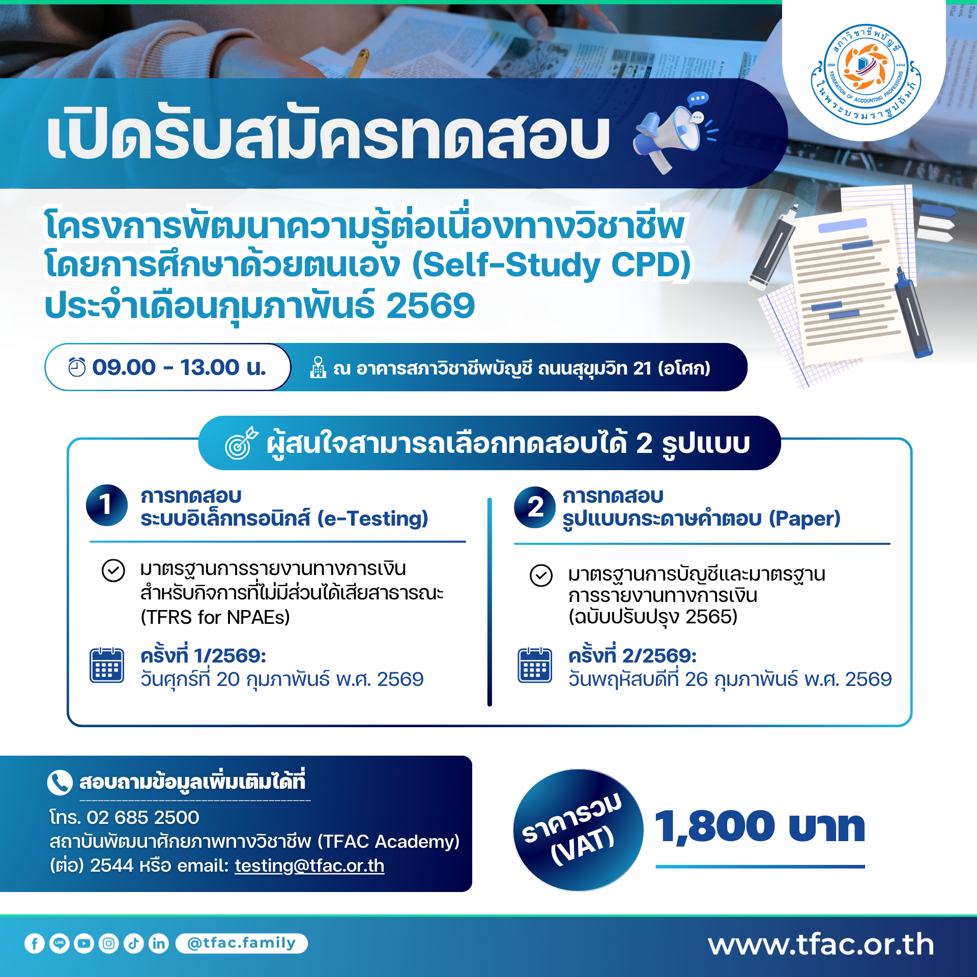 • เปิดรับสมัครทดสอบ โครงการพัฒนาความรู้ต่อเนื่องทางวิชาชีพโดยการศึกษาด้วยตนเอง (Self-Study CPD) ประจำเดือนกุมภาพันธ์ 2569