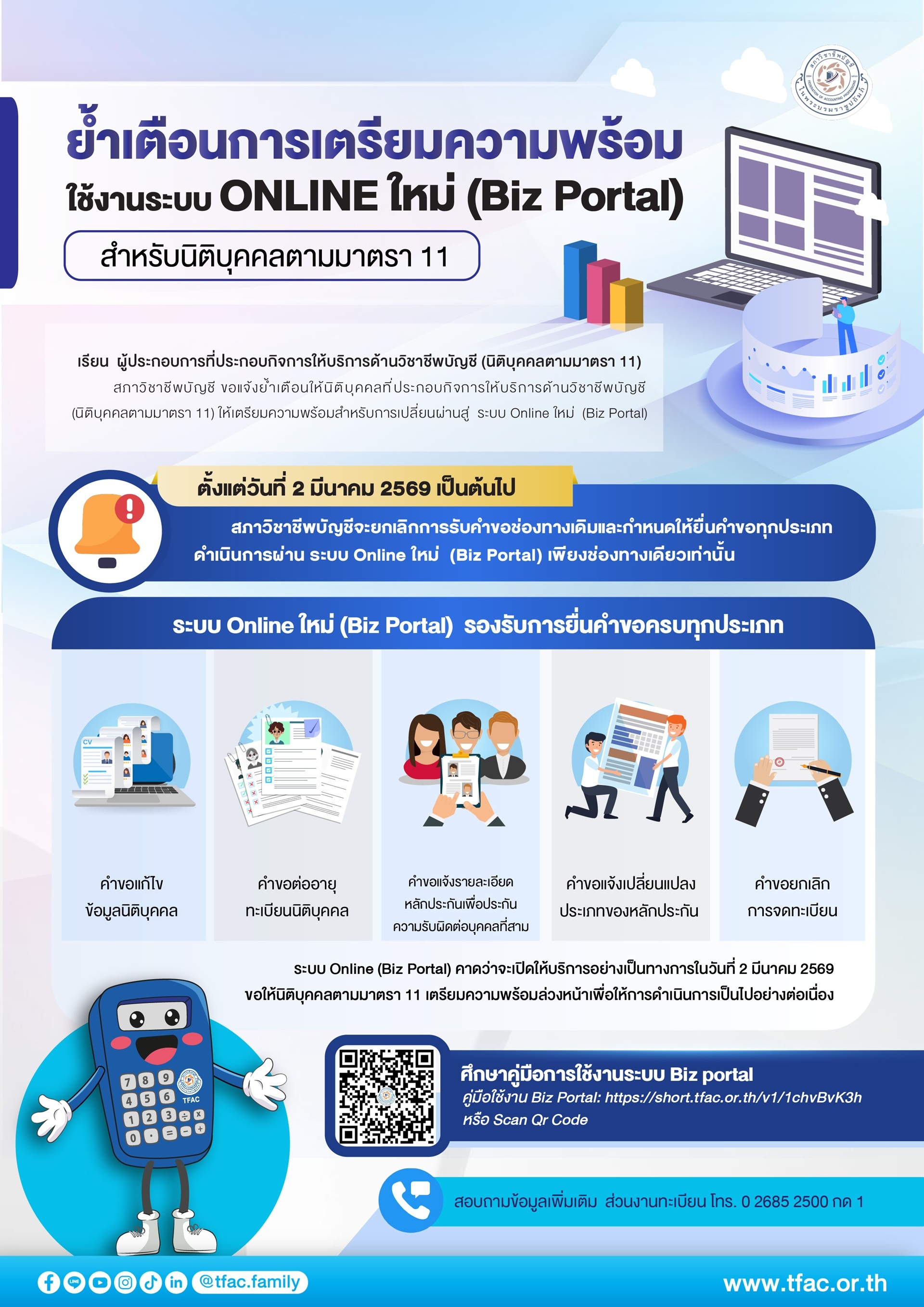 📆 ตั้งแต่ 2 มีนาคม 2569 เป็นต้นไป สภาวิชาชีพบัญชีจะ ยกเลิกการยื่นคำขอผ่านทุกช่องทางเดิม และกำหนดให้ยื่นคำขอ ทุกประเภทผ่านระบบ Biz Portal เพียงช่องทางเดียว