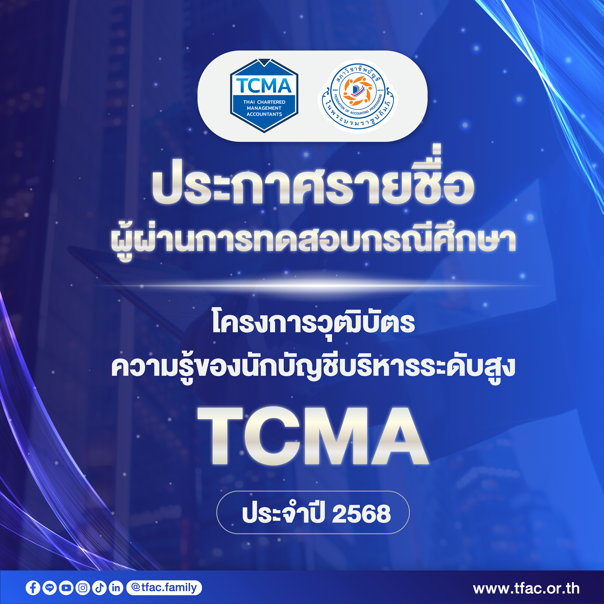 ประกาศรายชื่อผู้ผ่านการทดสอบกรณีศึกษาโครงการวุฒิบัตรความรู้ของนักบัญชีบริหารระดับสูง (TCMA) ประจำปี 2568