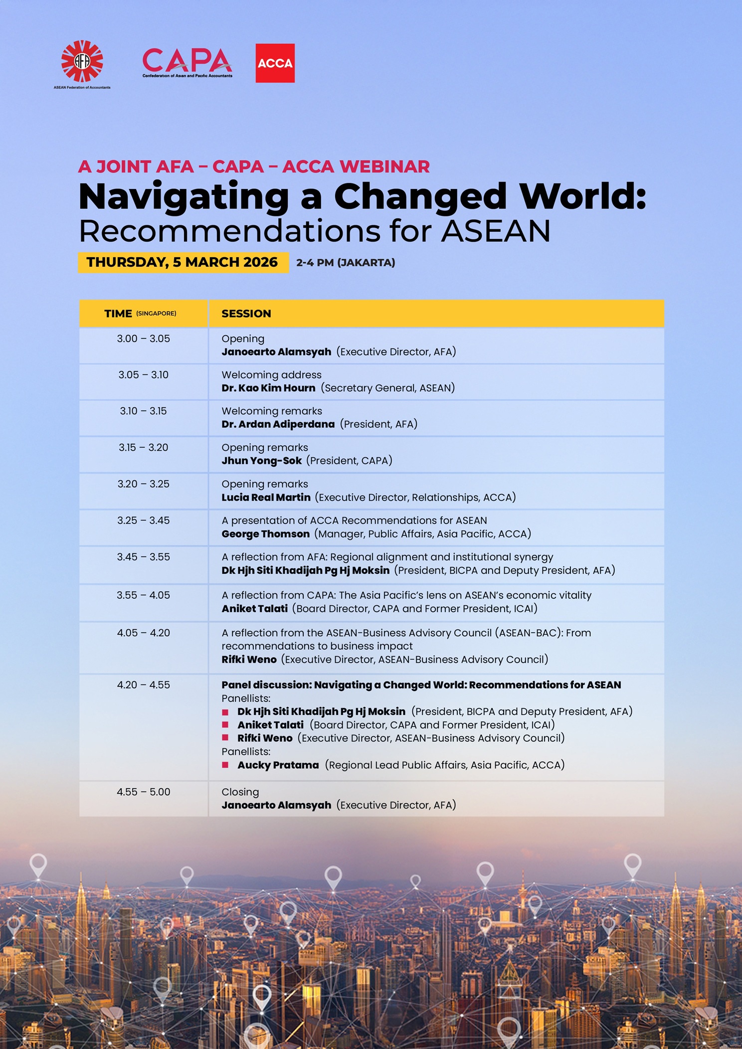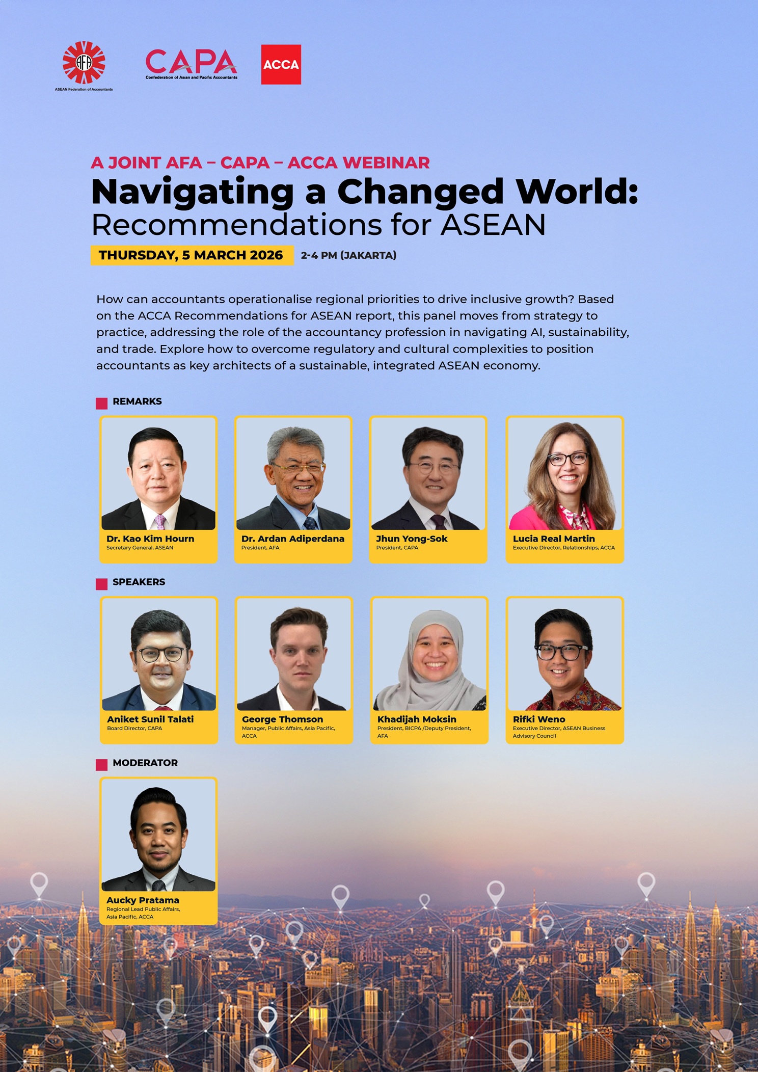 We cordially invite all ASEAN Chartered Professional Accountants (ASEAN CPAs) to stay ahead of the curve and explore the shifting landscape of the accounting profession. Join this high-level webinar co-hosted by three powerhouse organizations: the ASEAN Federation of Accountants (AFA), the Confederation of Asian and Pacific Accountants (CAPA), and the Association of Chartered Certified Accountants (ACCA). As an ASEAN CPA, this is your premier opportunity to gain regional strategic insights and apply them to drive Sustainable Growth and resilience for both your organization and your career.
