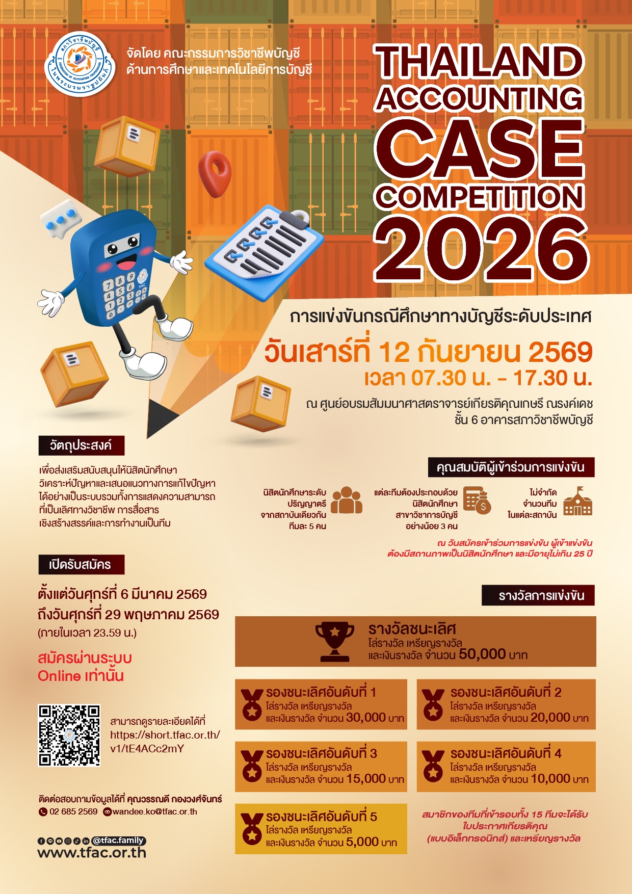 กลับมาอีกครั้ง…กับการแข่งขันกรณีศึกษาทางบัญชีระดับประเทศ ครั้งที่ 10 ประจำปี 2569 “Thailand Accounting Case Competition 2026” กำหนดจัดขึ้นในวันเสาร์ที่ 12 กันยายน 2569 เวลา 07.30 น. - 17.30 น. ณ ศูนย์อบรมสัมมนาศาสตราจารย์เกียรติคุณเกษรี ณรงค์เดช ชั้น 6 อาคารสภาวิชาชีพบัญชี โดยเปิดรับสมัครตั้งแต่วันที่ 6 มีนาคม 2569 ถึงวันที่ 29 พฤษภาคม 2569 รายละเอียดการรับสมัคร ดังนี้