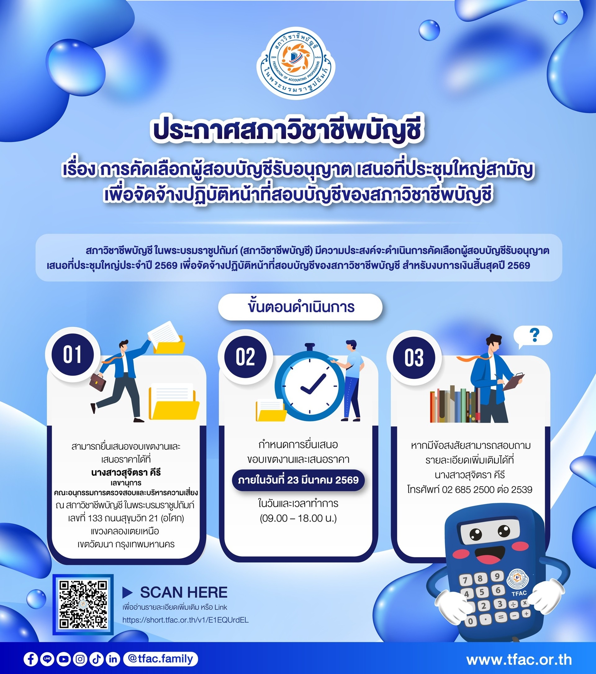 สภาวิชาชีพบัญชี ในพระบรมราชูปถัมภ์ (สภาวิชาชีพบัญชี) มีความประสงค์จะดำเนินการคัดเลือกผู้สอบบัญชีรับอนุญาตเสนอที่ประชุมใหญ่ประจำปี 2569 เพื่อจัดจ้างปฏิบัติหน้าที่สอบบัญชีของสภาวิชาชีพบัญชี สำหรับงบการเงินสิ้นสุดปี 2569