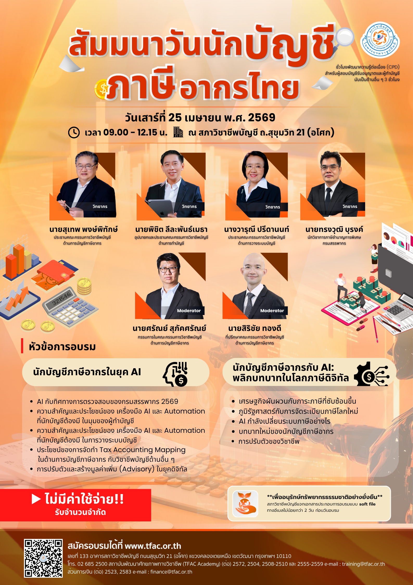 เสริมสร้างความรู้ ความเข้าใจ และทักษะของผู้ประกอบวิชาชีพบัญชีภาษีอากรเกี่ยวกับบทบาทในยุคดิจิทัลและ AI แนวโน้มระบบภาษีและการตรวจสอบของภาครัฐ ใน “สัมมนาวันนักบัญชีภาษีอากรไทย 2569”