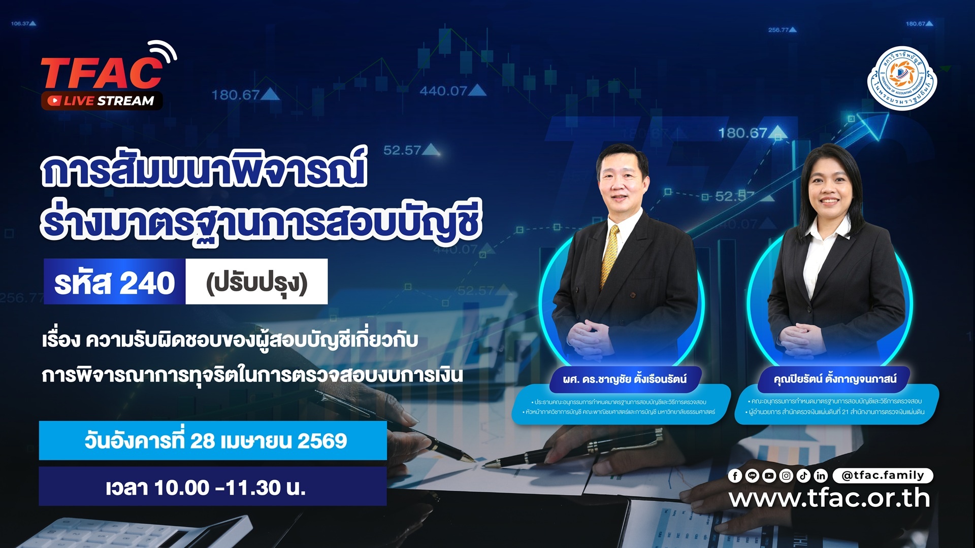 ด้วยคณะกรรมการมาตรฐานการสอบบัญชีและการให้ความเชื่อมั่นระหว่างประเทศ (International Auditing and Assurance Standards Board - IAASB) ได้เผยแพร่ ISA 240 (Revised) - The Auditor’s Responsibilities Relating to Fraud in an Audit of Financial Statements ฉบับสมบูรณ์ ซึ่งถือปฏิบัติกับการตรวจสอบสำหรับรอบบัญชีที่เริ่มในหรือหลังวันที่ 15 ธันวาคม 2569 (วันที่ถือปฏิบัติในต่างประเทศ) โดยคณะอนุกรรมการกำหนดมาตรฐานการสอบบัญชีและวิธีการตรวจสอบ (คณะอนุกรรมการ) ภายใต้คณะกรรมการวิชาชีพบัญชีด้านการสอบบัญชี ได้ดำเนินการแปลและอนุมัติให้เผยแพร่ “ร่างมาตรฐานสอบบัญชี รหัส 240 (ปรับปรุง) เรื่องความรับผิดชอบของผู้สอบบัญชีเกี่ยวกับการพิจารณาการทุจริตในการตรวจสอบงบการเงิน” หรือ TSA 240 (ปรับปรุง) เพื่อเปิดรับฟังความคิดเห็นตั้งแต่วันที่ 26 มีนาคม 2569 – 15 พฤษภาคม 2569 โดยร่างมาตรฐานฉบับนี้คาดว่าจะนำมาถือปฏิบัติในประเทศไทย ให้ถือปฏิบัติกับการตรวจสอบงบการเงินสำหรับรอบบัญชีที่เริ่มในหรือหลังวันที่ 15 ธันวาคม 2570 ท่านสามารถศึกษารายละเอียดของร่าง TSA 240 ฉบับเต็ม ได้ที่ Click และร่วมแสดงความคิดเห็นต่อการเตรียมความพร้อมในการนำไปปฏิบัติ หรือให้ข้อเสนอแนะเพิ่มเติมเกี่ยวกับการแปลร่างมาตรฐานฉบับดังกล่าวภายในวันที่ 15 พฤษภาคม 2569 ผ่าน google form Click