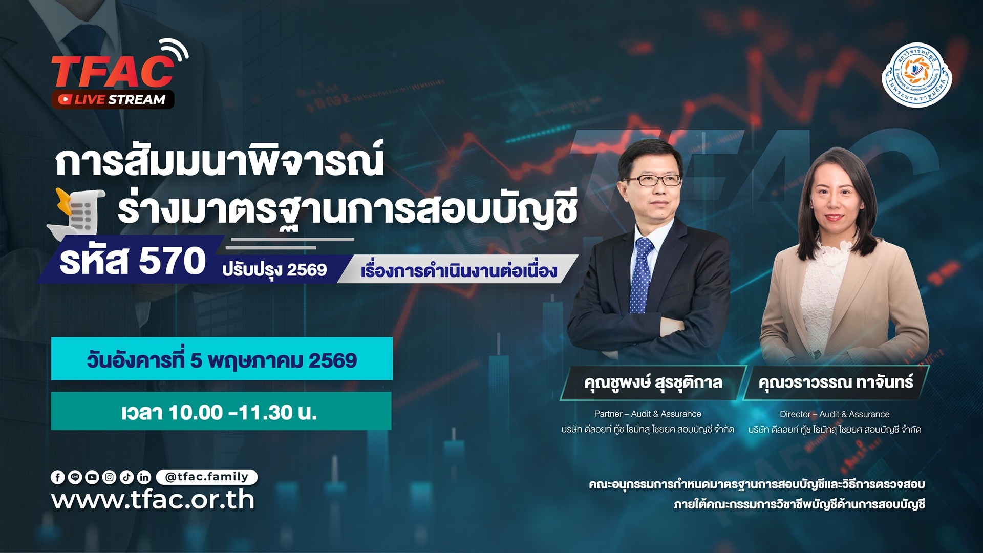 สภาวิชาชีพบัญชีขอเชิญท่านร่วมรับฟัง “การสัมมนาพิจารณ์ร่างมาตรฐานการสอบบัญชี รหัส 570 (ปรับปรุง 2569) เรื่องการดำเนินงานต่อเนื่อง” ผ่านช่องทาง Facebook Live ในวันอังคารที่ 5 พฤษภาคม 2569 เวลา 10.00 -11.30 น.